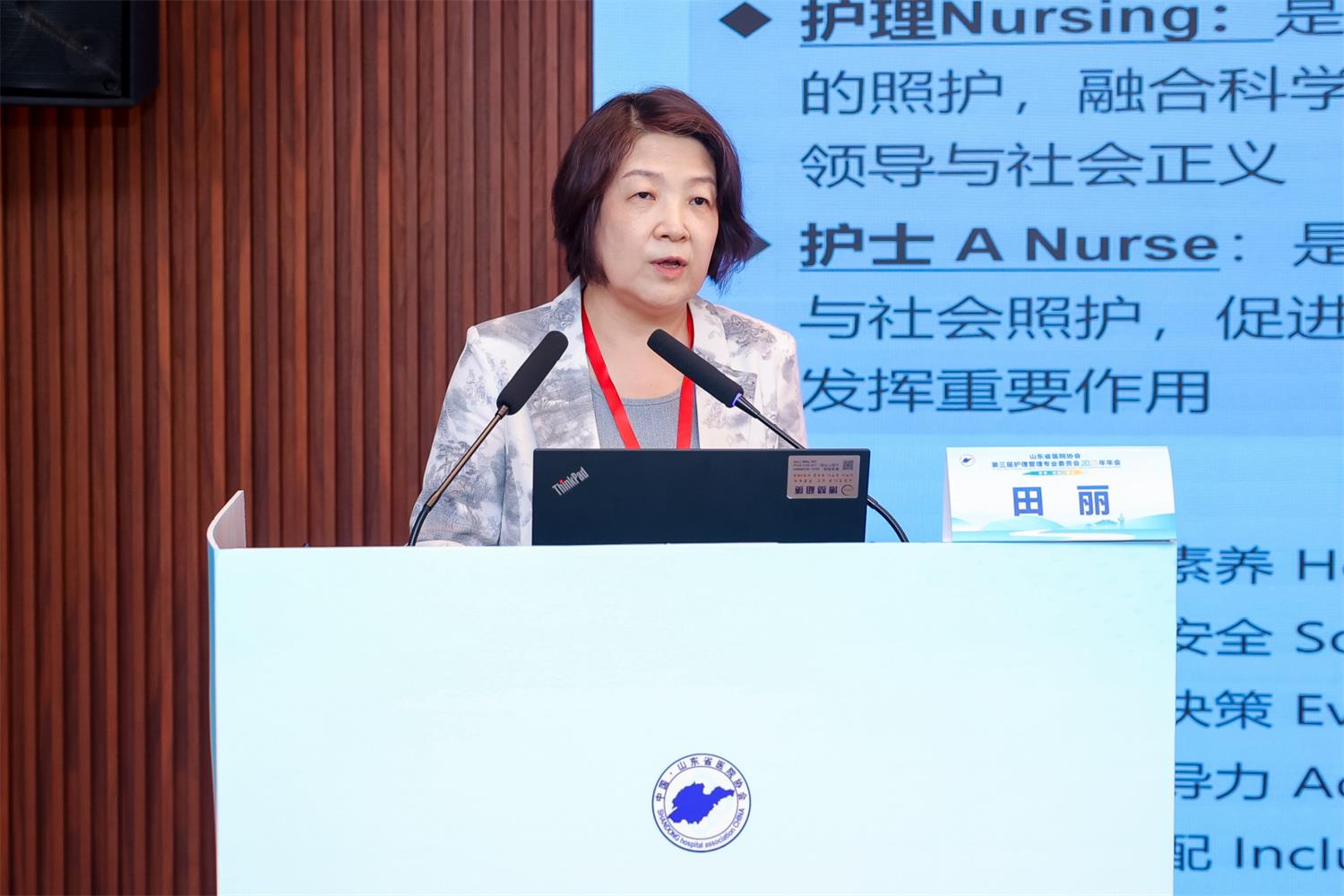 赵升田会长代表山东省医院协会致辞,他回顾了山东省医院协会自1996年成立以来,始终致力于推动全省医疗事业发展,护理管理专业委员会作为协会的重要组成部分,在促进护理学科建设,提升护理管理水平方面发挥着关键作用。他肯定了护理在医疗体系中不可替代的核心价值,指出护理不仅是医疗行为的重要延伸,更是连接诊断、治疗与康复的关键桥梁。他呼吁各位参会同仁在会议中积极参与、深入探讨,为保障人民群众健康、促进山东省护理事业高质量发展贡献更大的力量。