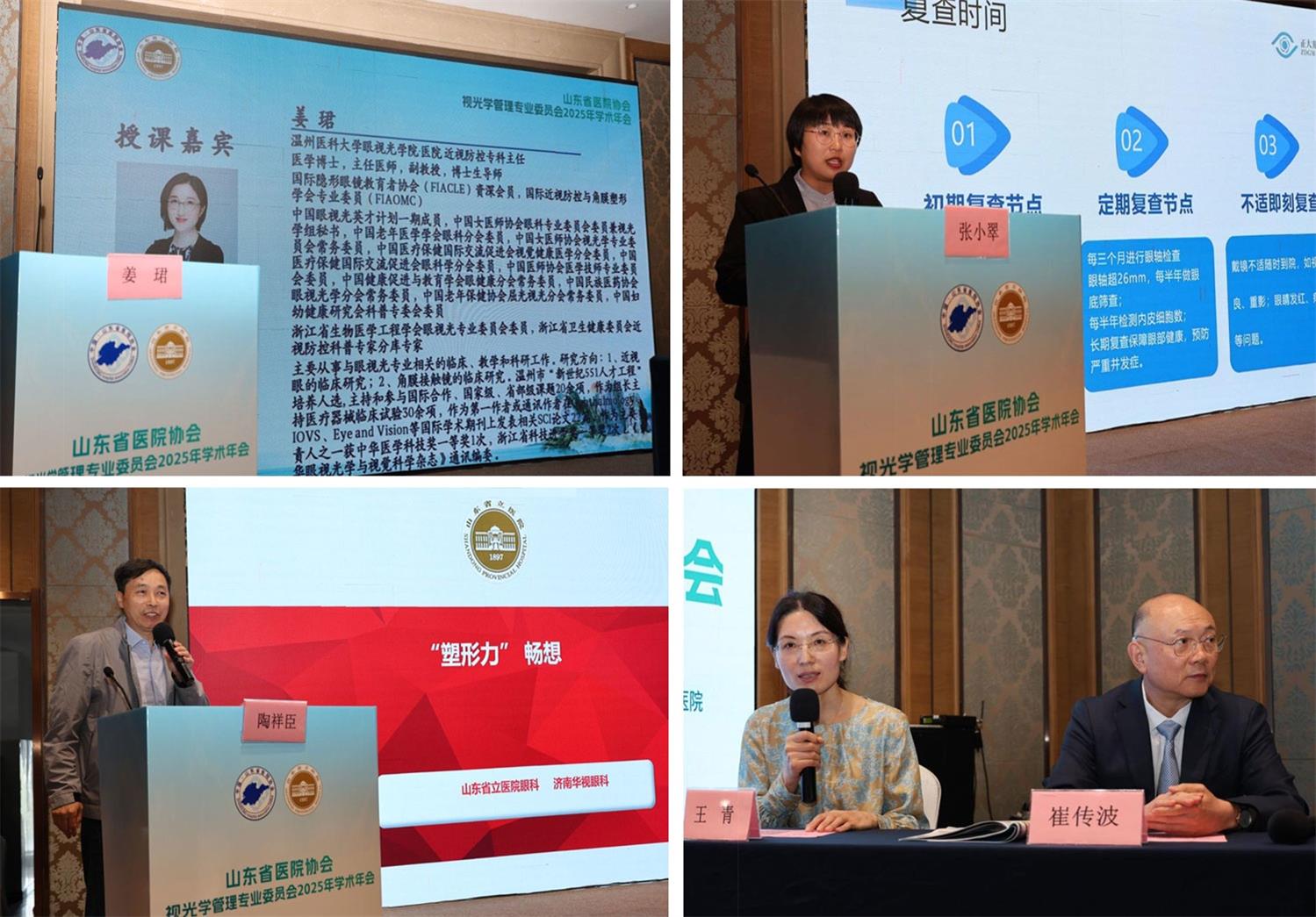随后,温州眼视光医院姜珺带来《角膜塑形镜验配及进展》的专题报告,展示了该领域的最新研究成果;潍坊眼科医院张小翠以《角膜塑形镜佩戴后全流程服务》为题,强调了全程服务管理的重要性;山东第一医科大学附属省立医院陶祥臣则就《塑形镜&塑形力》展开专业解析,深入探讨了二者之间的内在联系。本环节由王青、崔传波共同主持。