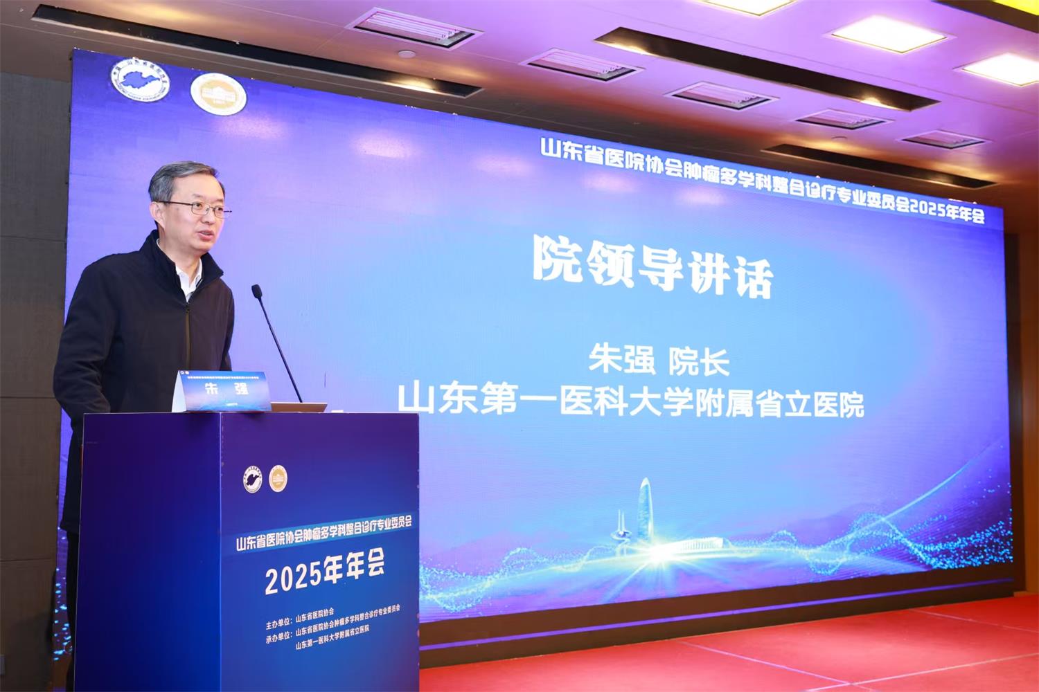 朱强副院长在致辞中介绍了山东省立医院的发展情况及医院肿瘤科的建设成果与学科优势,医院在临床实践与科研创新方面的成绩,持续推动了诊疗水平与服务能力的提升。他结合医院工作实际,分析讲解了肿瘤治疗的“五化”理念,即内科的外科化、外科的微创化、肿瘤治疗的精准化、临床研究的普遍化以及疾病管理的全程化,这些理念共同促进了肿瘤诊疗更加系统、高效,并有效提升了治疗效果与患者体验。他希望此次会议的召开,能够进一步激励广大医务工作者不断提高诊治水平,创新医学技术,务实工作、率先垂范,为广大肿瘤患者提供更优质的医疗服务。