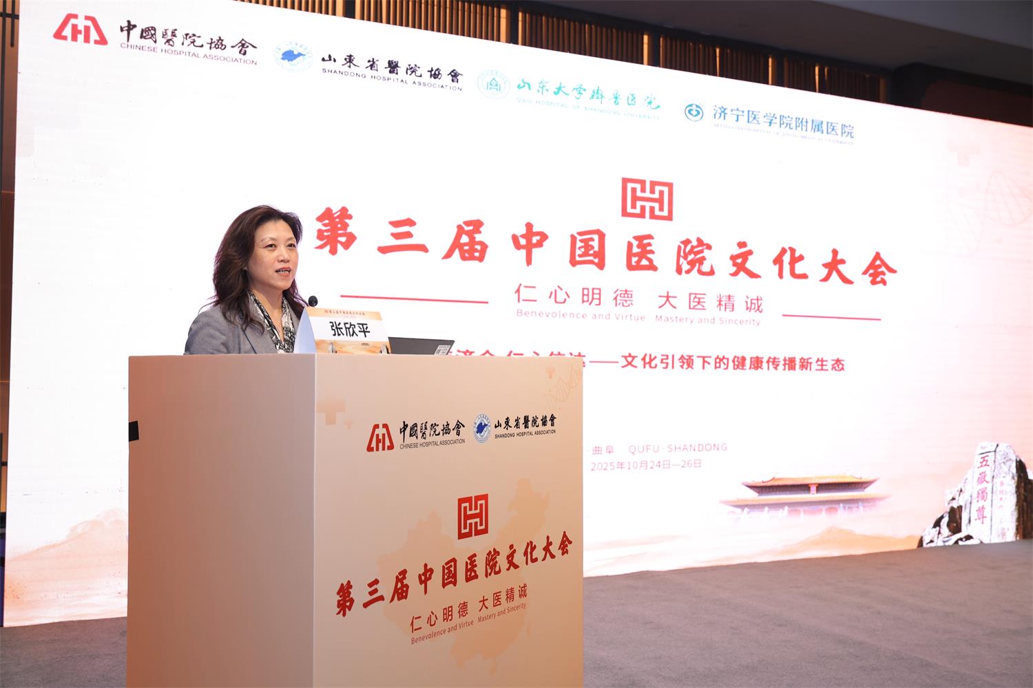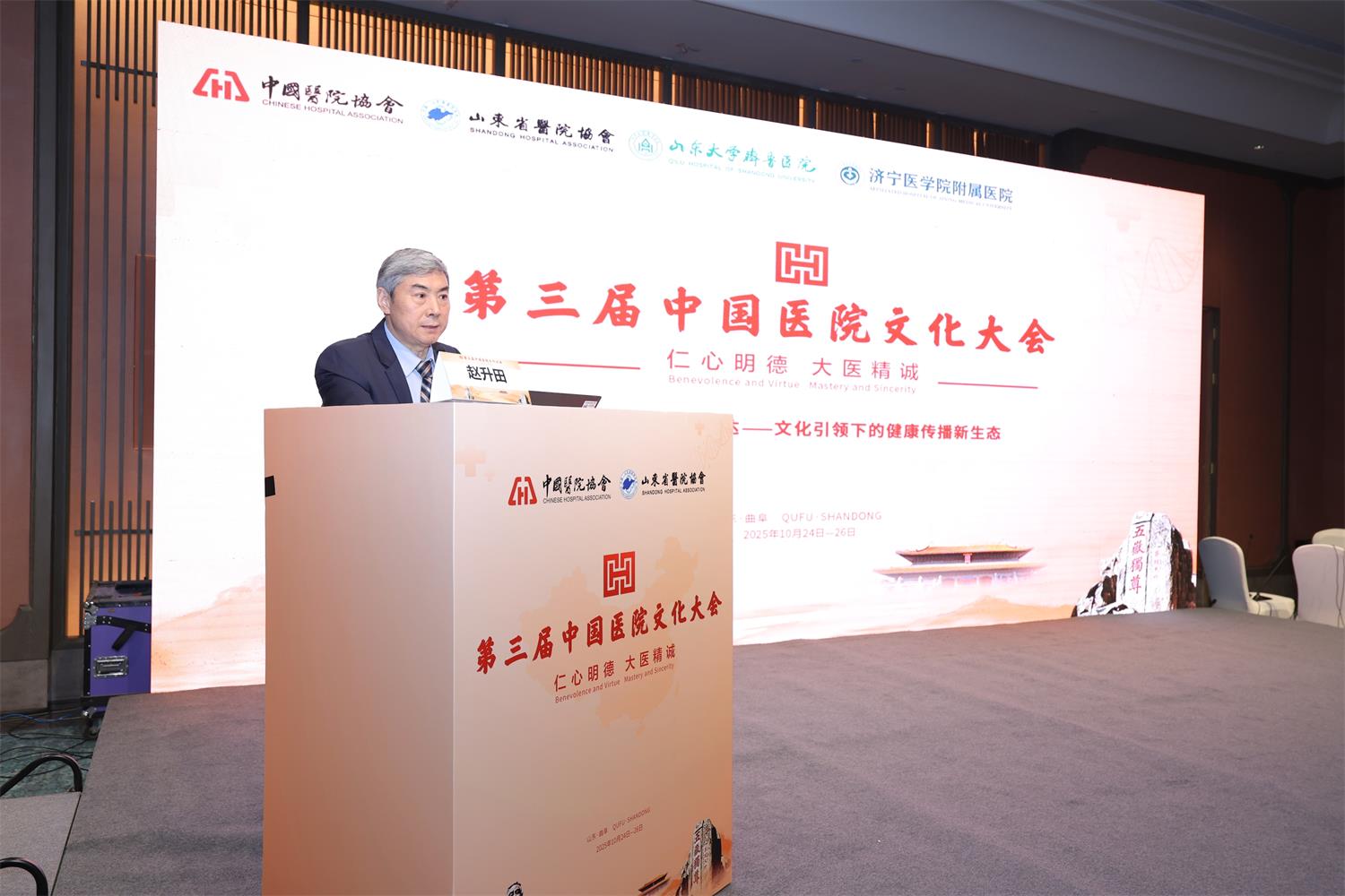 10月25日,由山东省医院协会主办,山东省医院协会健康传播专委会、山东大学齐鲁医院、济宁医学院附属医院共同承办的山东省医院协会健康传播专业委员会2025年学术年会暨首届山东省公立医院健康科普创新大赛在山东曲阜成功举办。此次会议作为第三届中国医院文化大会平行分会场,以“博施济众仁心信达—文化引领下的健康传播新生态”为主题同步召开,旨在共商新时代文化引领下健康传播的创新发展之路。山东省医院协会会长赵升田、山东大学齐鲁医院党委副书记张欣平、济宁医学院附属医院党委副书记祖久胜出席开幕式并致辞。全省各级医疗机构宣传思想文化工作负责人和业务骨干100余人齐聚一堂,共同见证这一健康传播领域的盛会。山东省医院协会健康传播专委会主任委员、齐鲁医院党委宣传统战部部长李宁主持会议开幕式。