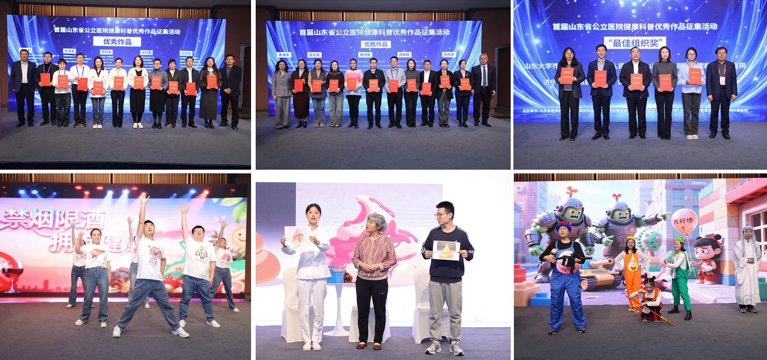 会议举行首届山东省公立医院健康科普创新大赛颁奖仪式。大会为优胜作品奖、优秀作品奖、最佳组织奖获得者颁发了证书。山东大学齐鲁医院、山东健康淄博医院、章丘区人民医院的医护团队为大家带来精彩的科普情景剧表演,让观众在欢声笑语中学习到实用的健康知识,赢得现场阵阵掌声。