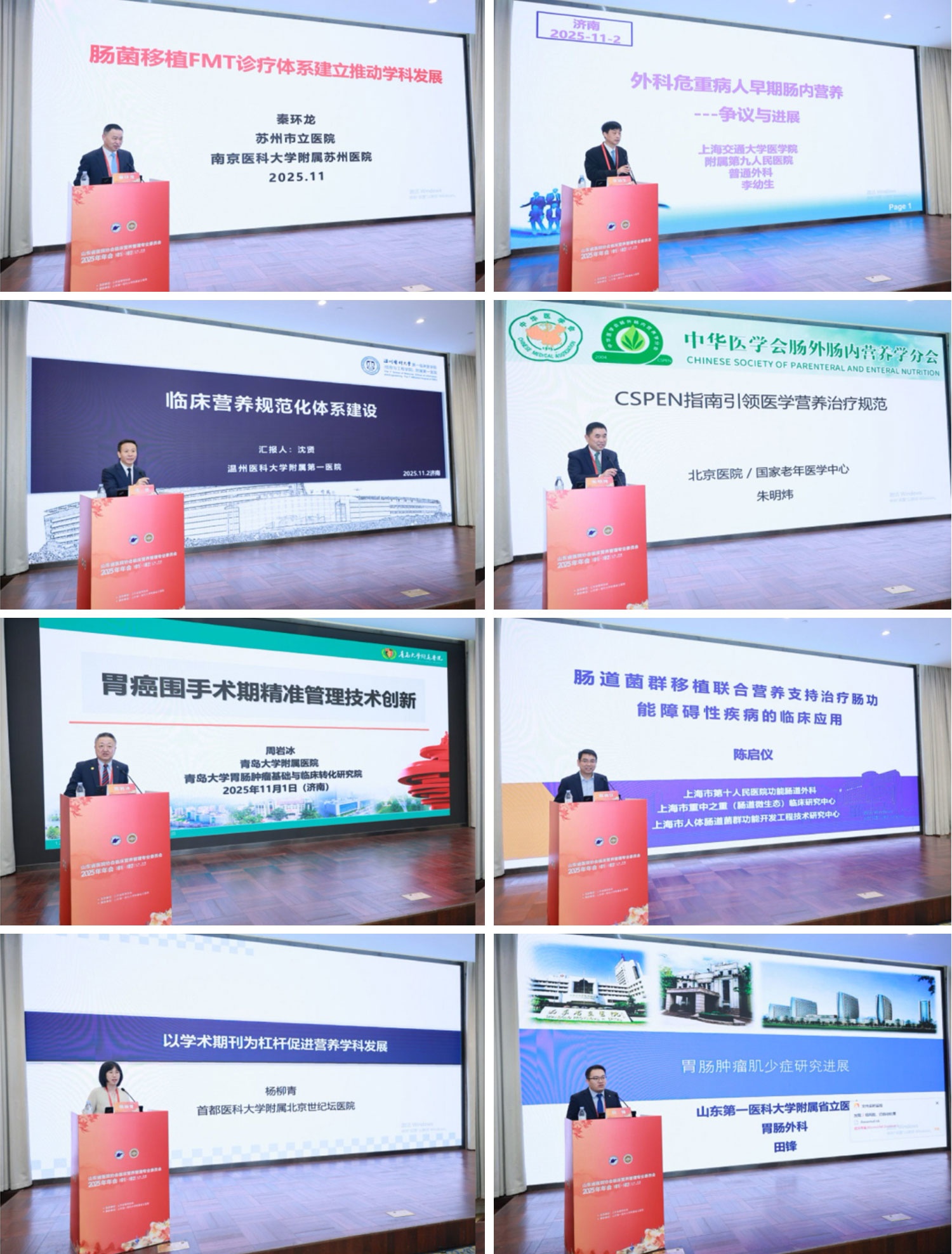 出席本次会议并授课的知名专家,有中华医学会肠外肠内营养学分会候任主任委员、苏州市立医院秦环龙教授,他以《肠菌移植(FMT)临床价值及科学意义》为题,深入剖析FMT技术在临床应用中的核心价值与科学内核,为肠道微生态干预领域提供理论与实践参考;上海市第九人民医院普外科主任李幼生教授聚焦外科重症管理,分享《外科危重病人早期肠内营养——争议与进展》,直面临床争议点,梳理学科最新进展,为重症患者营养支持方案优化提供方向;温州医科大学副校长、附属第一医院党委书记沈贤教授围绕《临床营养规范化体系建设》,从体系构建视角出发,探讨临床营养标准化、规范化发展路径,夯实学科发展基础;北京医院朱明炜教授以《CSPEN指南引领医学营养治疗规范》为主题,强调指南在临床实践中的指导作用,推动医学营养治疗向标准化、精准化迈进;上海市第十人民医院陈启仪教授聚焦肠功能障碍性疾病诊疗,分享《菌群移植联合营养支持策略在肠功能障碍性疾病的应用》,探索多技术联合干预的创新模式,拓展临床治疗思路;青岛大学附属医院周岩冰教授深耕胃癌诊疗领域,报告《胃癌围术期精准管理技术创新》,聚焦围术期全流程精准化管理,助力提升胃癌治疗疗效与患者预后;首都医科大学附属北京世纪坛医院杨柳青教授从学科发展支撑角度,作《以学术期刊为杠杆促进营养学科发展》主题演讲,阐述学术期刊在学科知识传播、科研成果转化中的重要作用,为学科建设提供新维度;山东省立医院胃肠外科田锋教授就《胃肠肿瘤肌少症研究进展》,解析肌少症与胃肠肿瘤关联机制及干预进展,为肿瘤患者综合管理提供新方向。