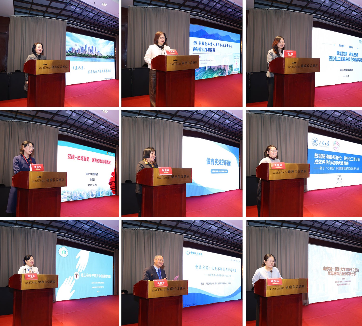 学术交流环节精彩纷呈。上海交通大学中国医院发展研究院健康社会工作研究所所长、中国医院协会医院社会工作暨志愿服务工作委员会主任委员季庆英教授以《未来已来,医务社会工作助力医院人文回归》为主题,深入解析了AI时代医务社会工作的核心价值与发展路径;北京清华长庚医院党委副书记兼纪委书记、中国医院协会医院社会工作暨志愿服务工作委员会副主任委员王克霞教授以《北京医务社会工作高质量发展探索与实践》为题,分享了北京地区在政策支持、人才培养、医校协同等方面的高质量发展经验;青岛大学附属妇女儿童医院副院长、工会主席高岩围绕《赋能提质共筑友好——医务社工助推生育友好探索实践》,介绍了覆盖全周期的特色服务体系建设成果;青岛大学附属医院服务管理部主任单信芝带来《党建+志愿服务:医路有我励精思政》的专题分享,介绍了以党建为引领的“医路有我”志愿服务体系,形成全周期服务格局并建立健全激励保障机制,为健康中国行动注入温暖力量。山东第一医科大学附属省立医院主任药师赵雪梅围绕有实效的科普活动,详细阐述了成人与儿童科普的不同核心理念、活动设计、组织流程及效果评价。济南市槐荫区社会工作者联合会副会长王凤华通过“心相连”项目启示医务社工需以数据构建专业话语权,推动服务从经验驱动向精细化、高质量迭代发展。山东第一医科大学第三附属医院安宁疗护中心护士长李玉贞以《社工在安宁疗护中的温柔力量》为题,分享了医务社工在安宁疗护中的实践经验,为行业发展提供了多元思路。曹县人民医院工会副主席王献华分享了“仁爱天使”志愿服务队以“七心信仰塔”为精神内核,实现从零星善举到系统工程等三大蝶变。山东第一医科大学附属省立医院医务社工刘玉丛分享了山东省立医院通过多学科协作、资源链接、专项援助等举措,形成了“预防-治疗-康复-保障”全方位服务模式,为罕见病防治提供了可借鉴的经验。与会专家的分享既有理论高度,又有实践深度,为行业发展提供了宝贵借鉴。