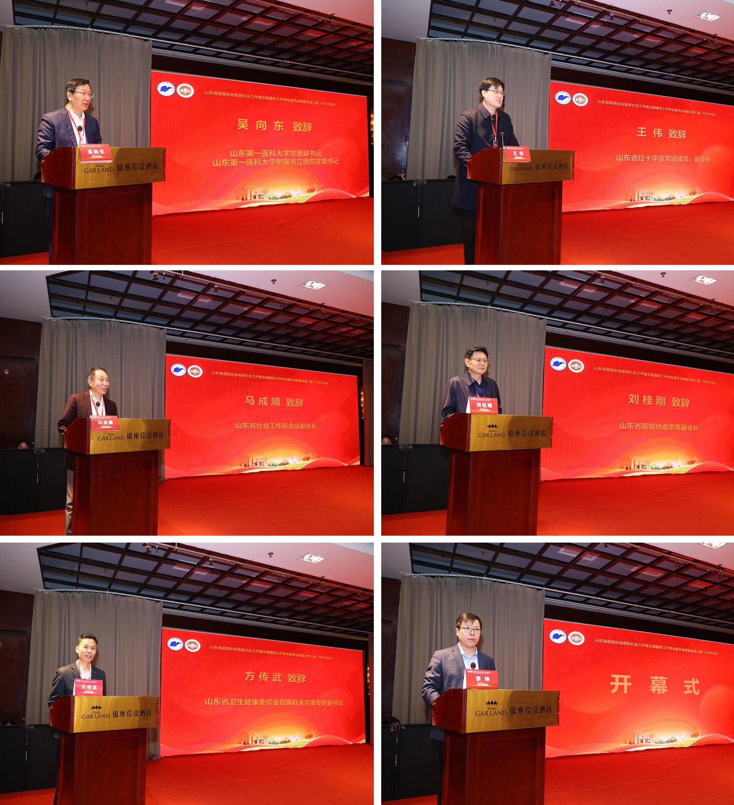 吴向东书记在致辞中表示,山东第一医科大学附属省立医院始终坚守公益性初心,将医务社会工作融入医疗服务全过程,通过多学科协作、志愿服务体系完善等举措,持续提升医疗服务温度。作为承办单位,医院将以本次会议为契机,深化与全省各界的交流合作,在学科建设、人才培养等方面持续发力,为行业发展贡献更大力量。王伟副会长强调,红十字事业与医务社工、医院协会工作初心使命契合且协作成效显著,就深化协作、推动医务社工与红十字事业融合发展提出希望,为健康山东建设与人道事业高质量发展做出贡献。马成顺副会长在致辞中肯定了我省医务社会工作与志愿服务在制度、服务、人才等方面的显著成效,并且围绕健康中国建设需求,从政治引领、专业提升等五方面提出发展方向。刘桂刚副会长强调,医务社会工作与志愿服务是现代医疗体系的关键构成,在化解医患矛盾等方面作用突出。当下各级医疗机构应积极探索创新。他对专委会提出强化体系、创新模式、多元协同三点期望,并表示协会将全力支持各分支机构工作,助力分支机构工作再上新台阶。方传武副书记指出,医务社会工作与志愿服务是医疗卫生服务体系的重要组成部分,在践行医学人文精神、促进医患和谐中发挥着不可替代的作用,希望新一届专委会强化体系建设、聚焦专业提升、营造良好氛围,推动工作再上新台阶。
