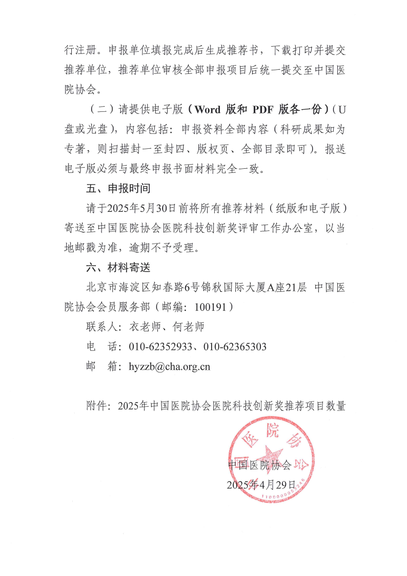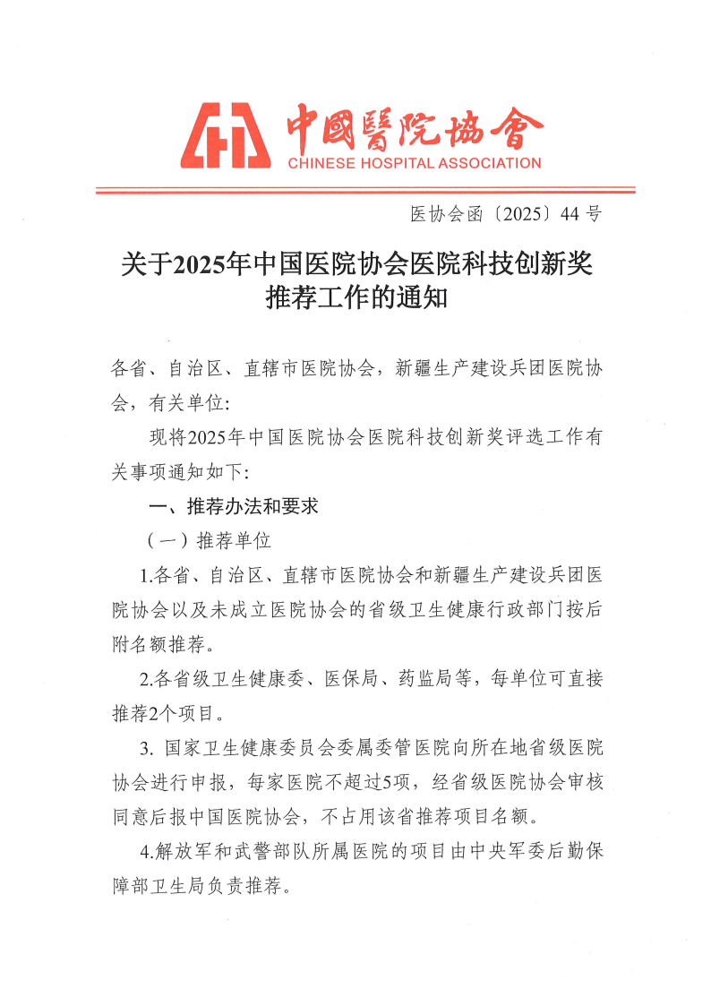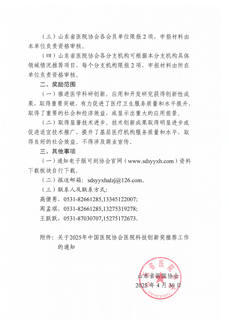 关于开展2025年中国医院协会医院科技创新奖山东省推荐工作的通知