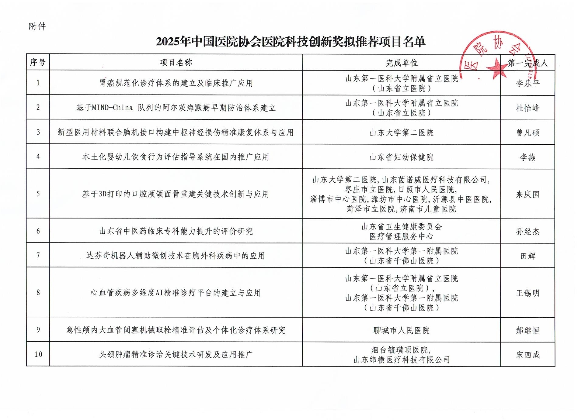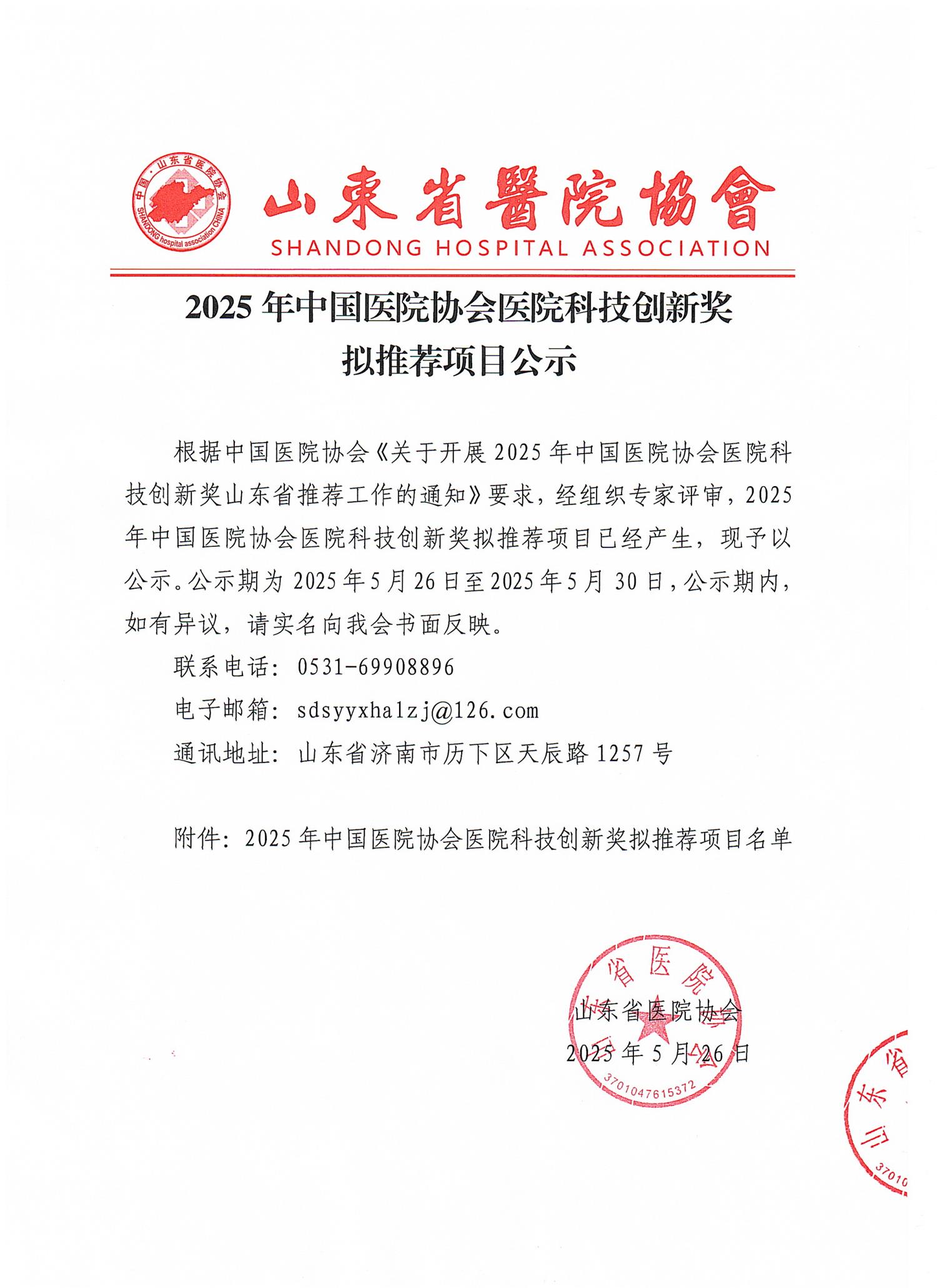 2025年中国医院协会医院科技创新奖拟推荐项目公示