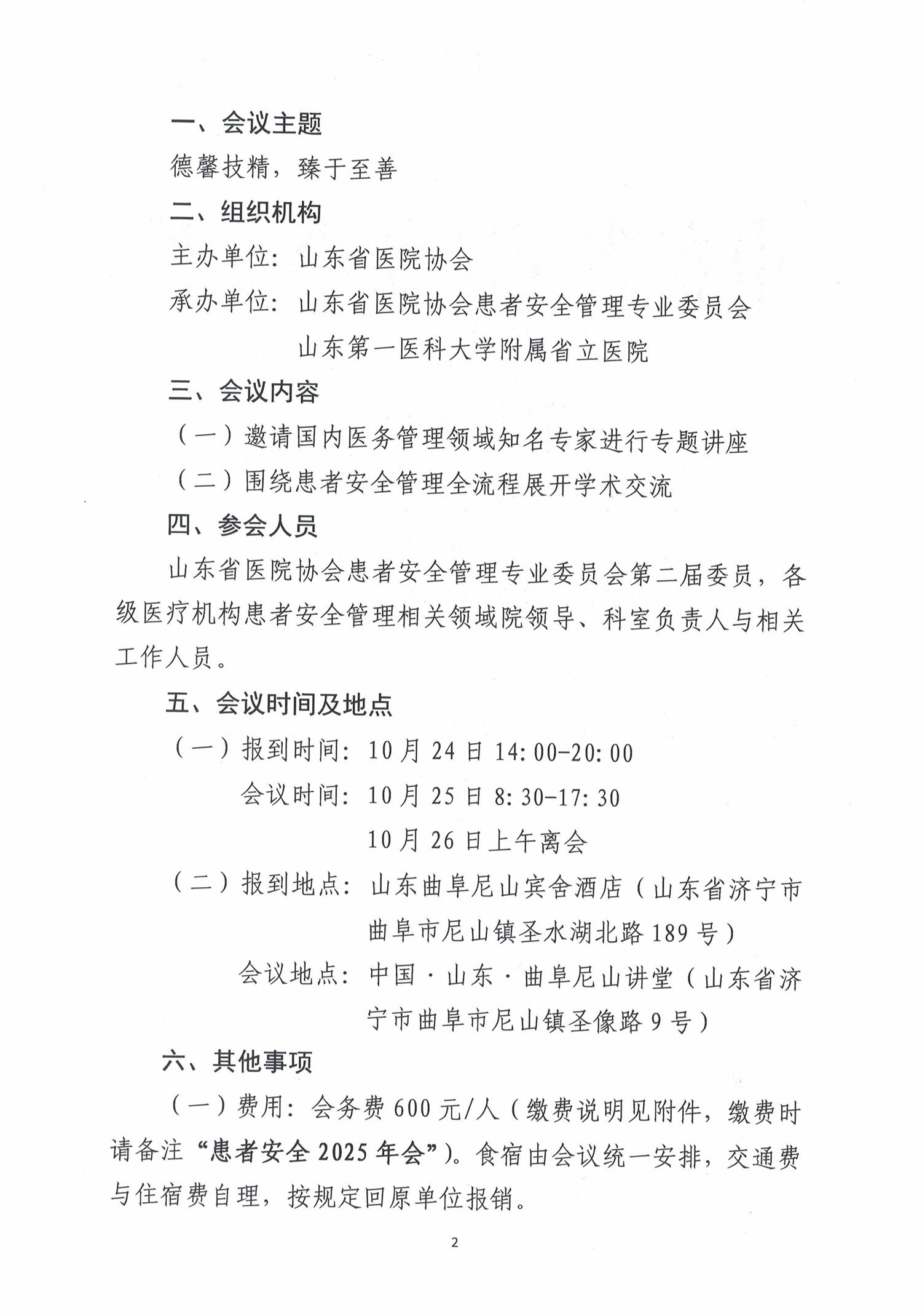关于召开山东省医院协会患者安全管理专业委员会2025年年会的通知