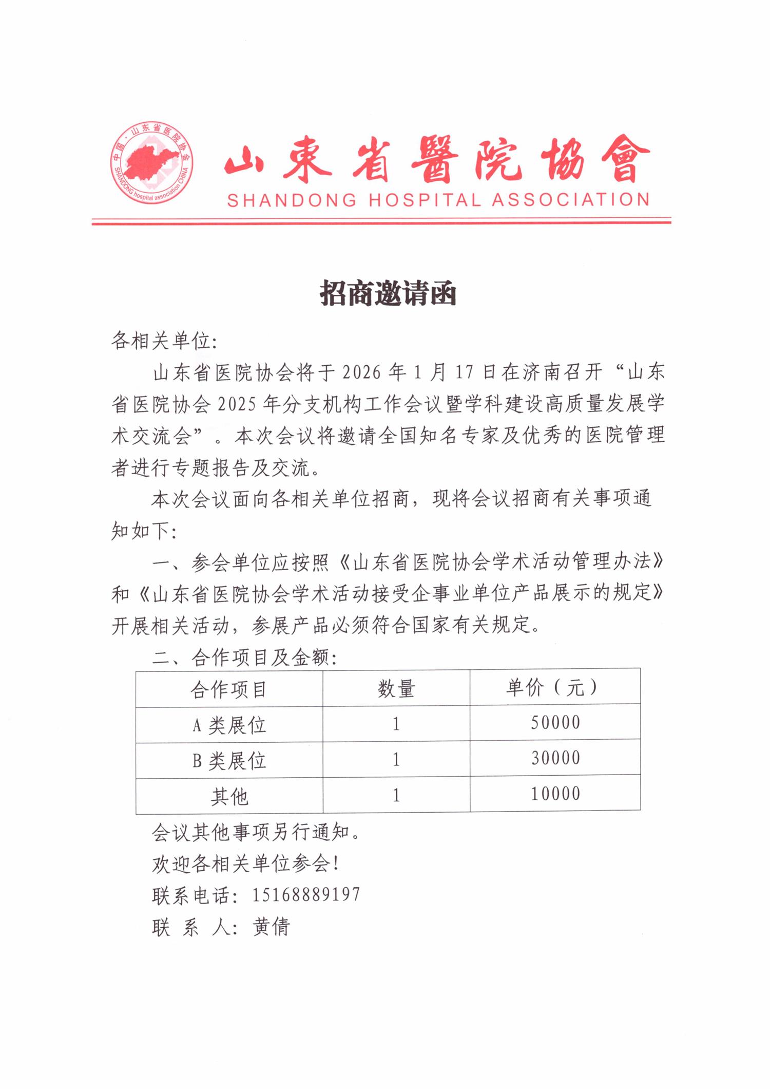 山东省医院协会2025年分支机构工作会议暨学科建设高质量发展学术交流会招商函