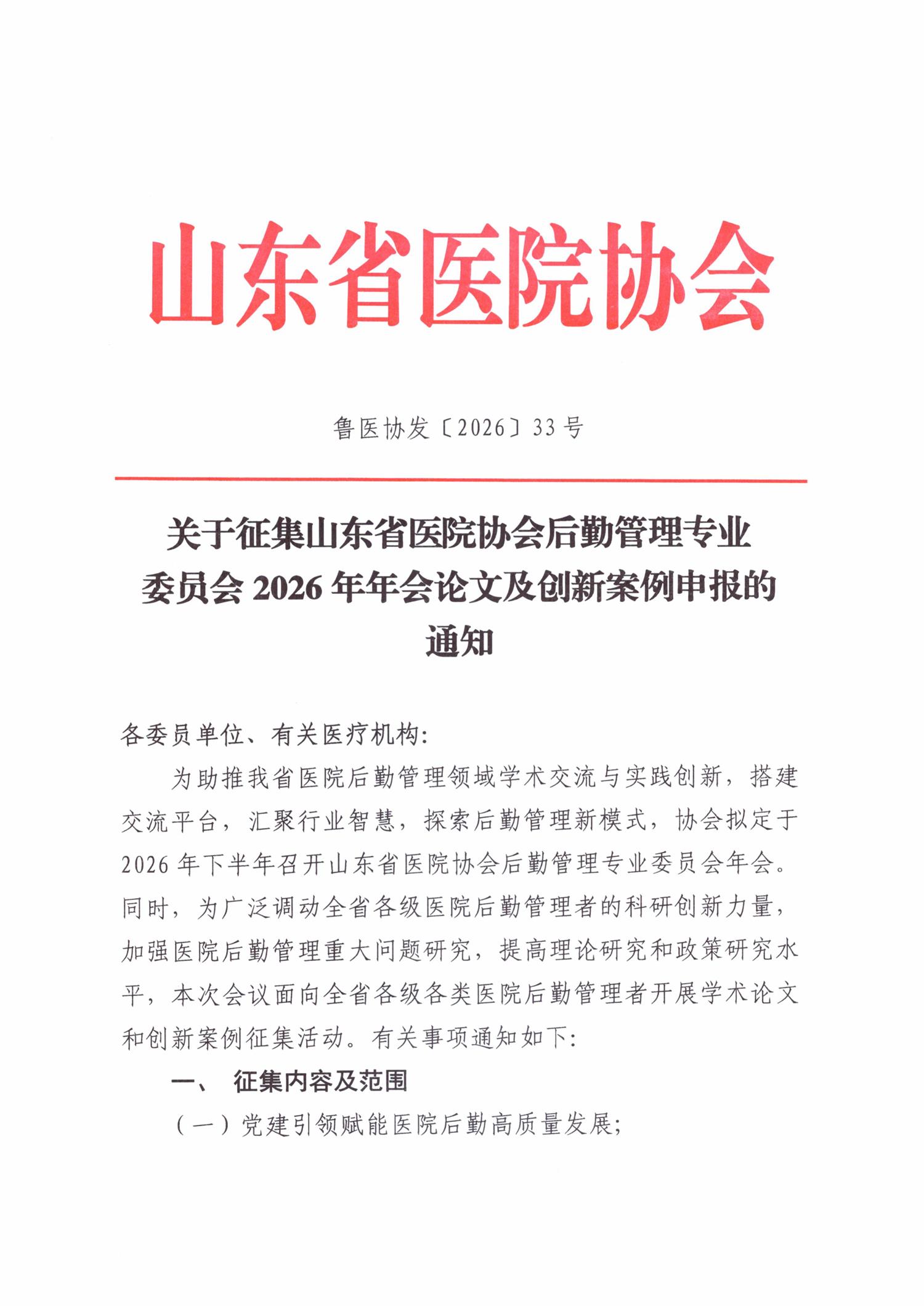关于征集山东省医院协会后勤管理专业委员会2026年年会论文及创新案例申报的通知