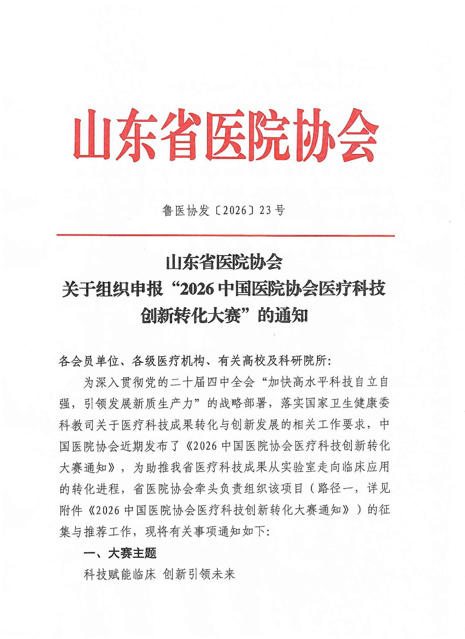 山东省医院协会关于组织申报“2026中国医院协会医疗科技创新转化大赛”的通知